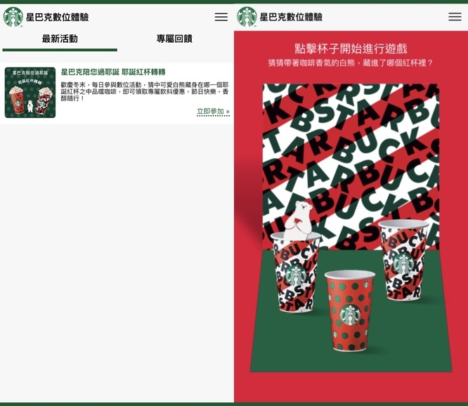 星巴克的耶誕紅杯轉轉數位活動,就是有趣的互動小遊戲。讓會員找尋可愛白熊是躲藏在哪一個耶誕紅杯,答對者即可獲得優惠。