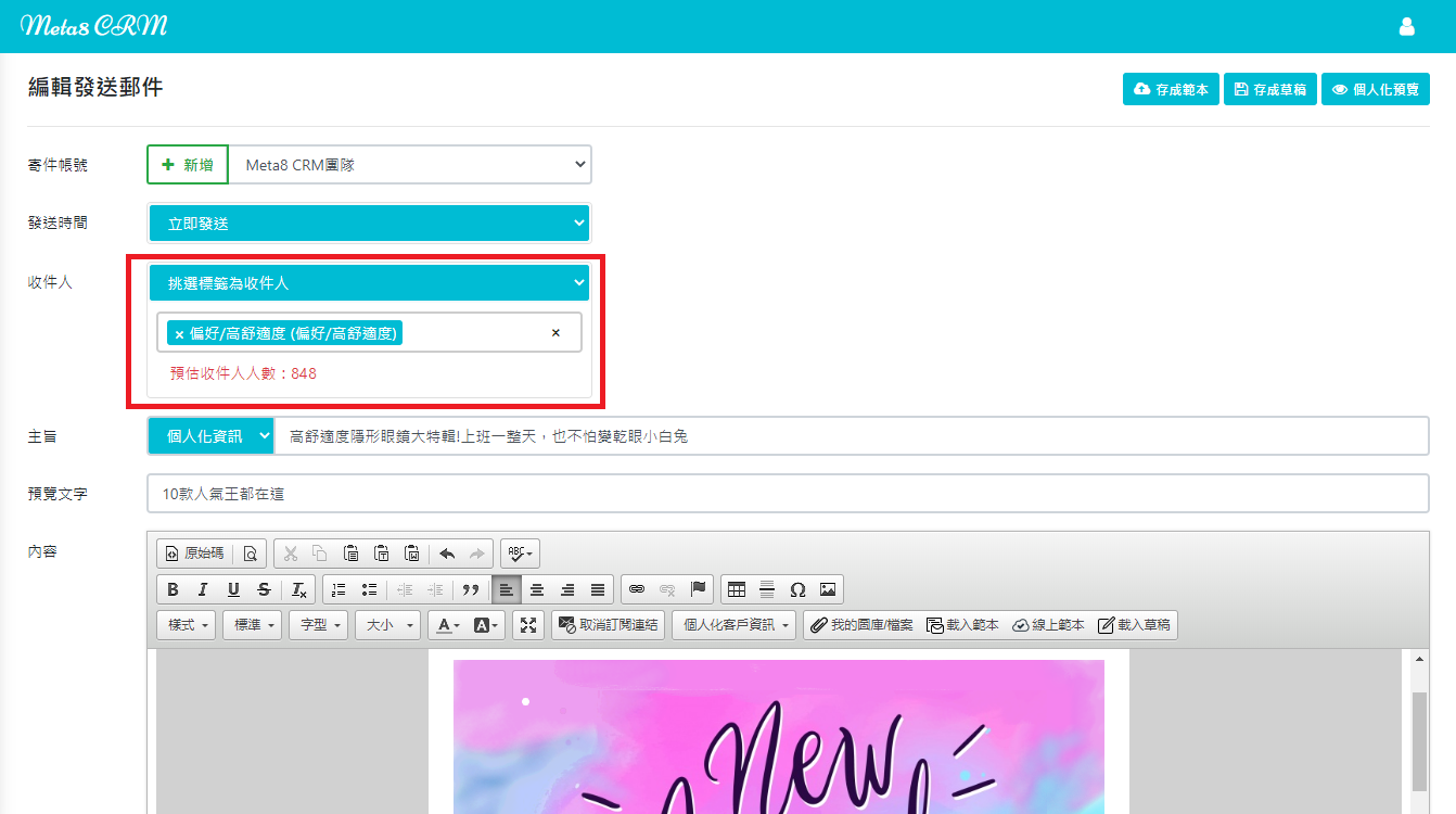 Meta8 CRM行銷郵件發送界面:標籤分眾行銷